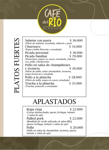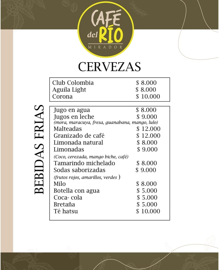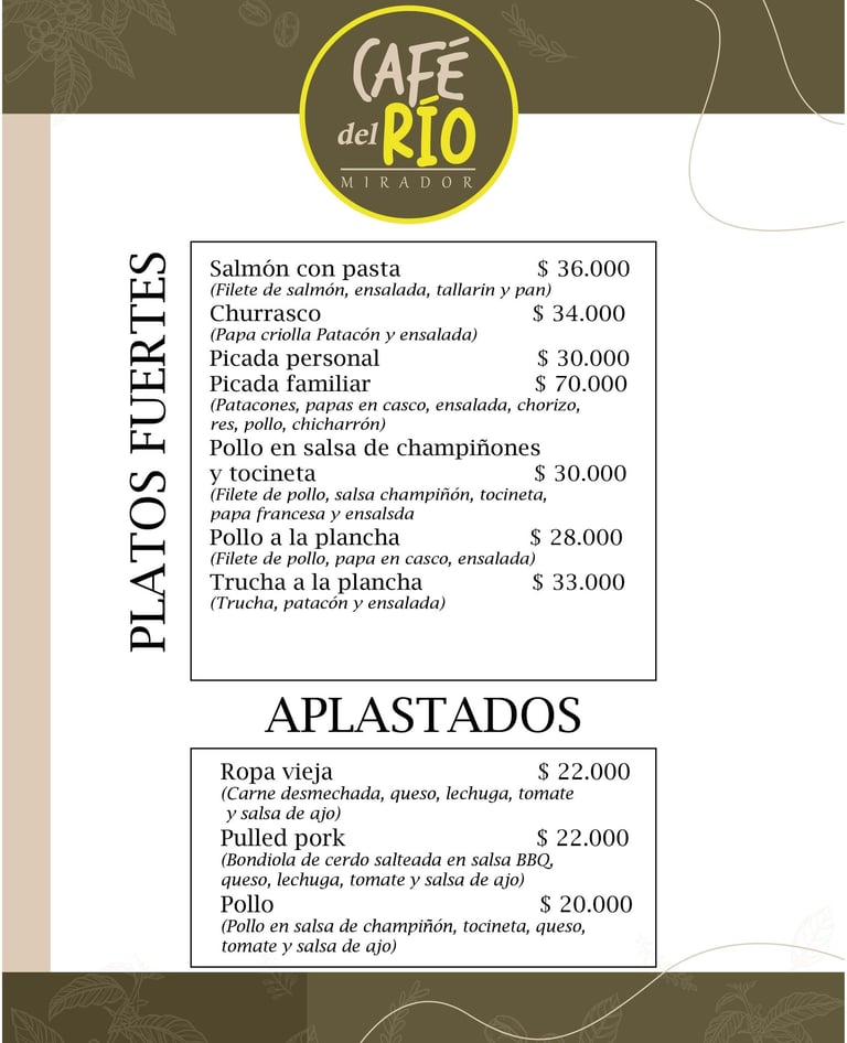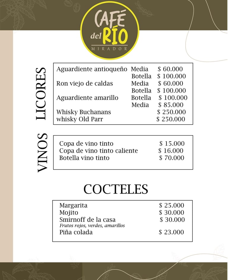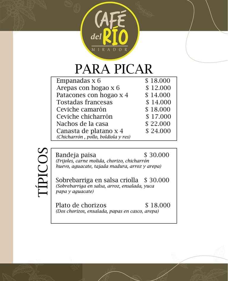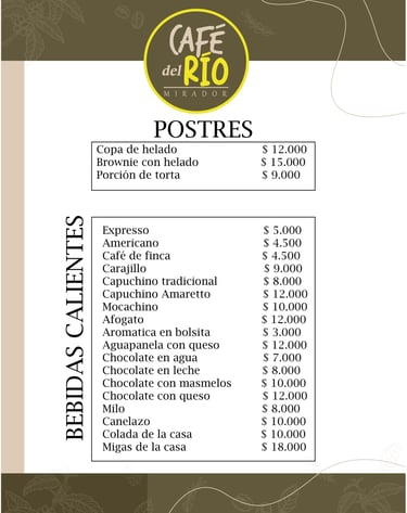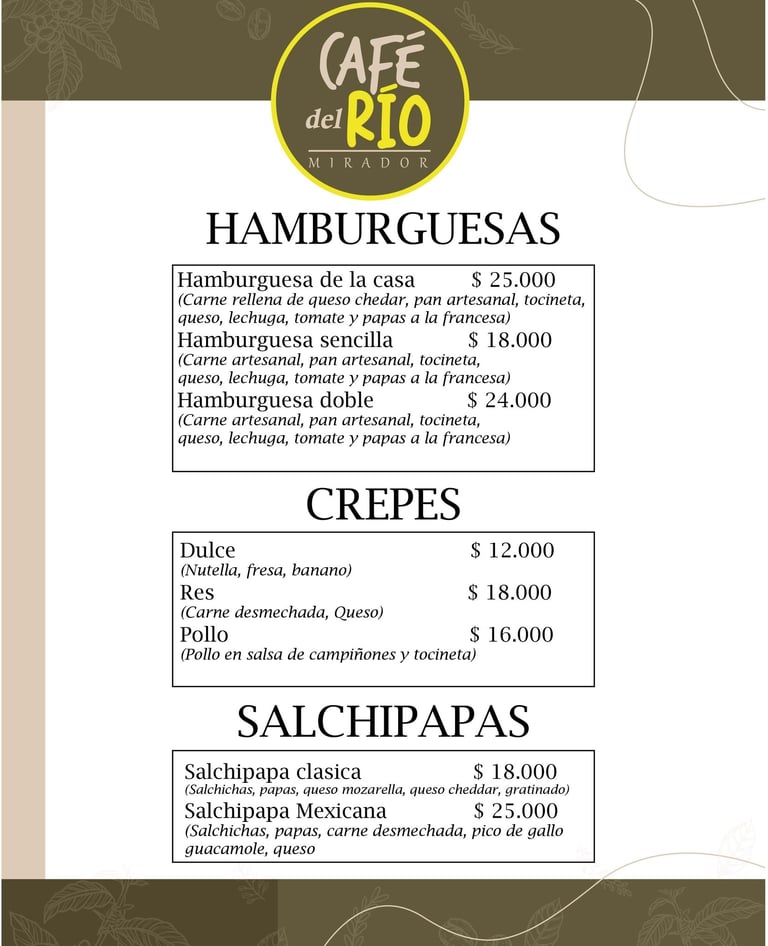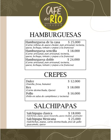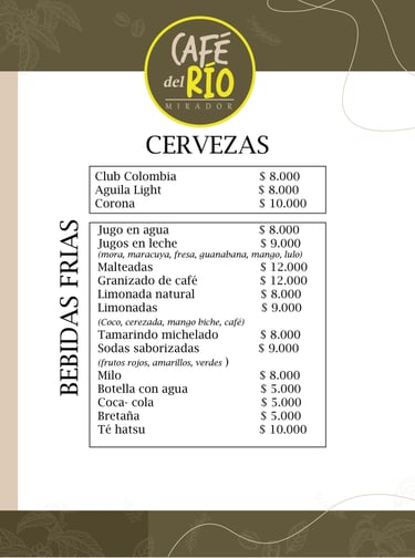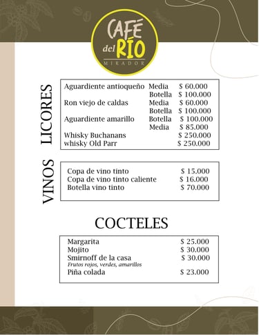 En Café del Río, te invitamos a un viaje culinario completo. Disfruta desde nuestros aromáticos cafés de finca y tradicionales chocolates con queso, hasta robustas hamburguesas, jugosos churrascos y la auténtica bandeja paisa. Complementa tu experiencia con refrescantes bebidas frías, una cuidada selección de vinos y licores, creativos cócteles y deliciosos postres, todo enmarcado por la vista más espectacular del Quindío.